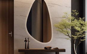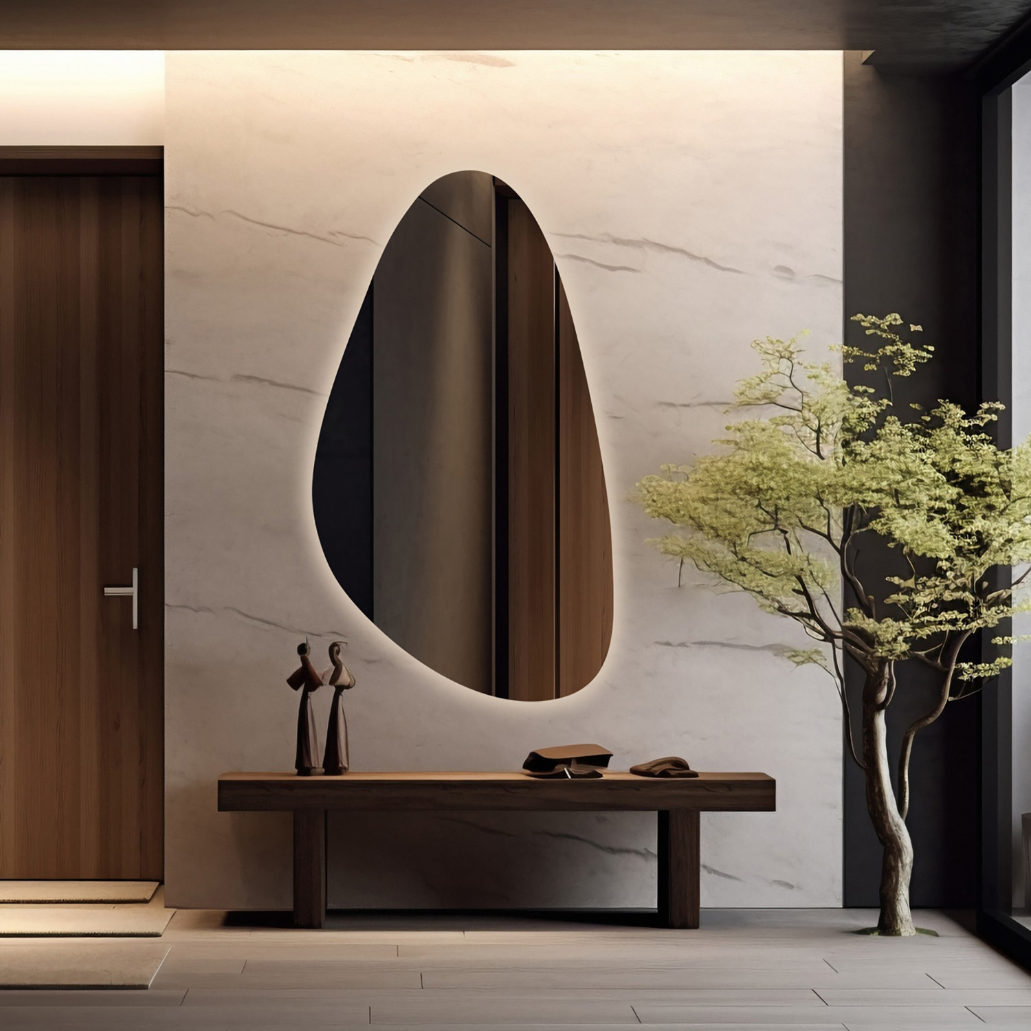 Monako to nieregularne lustro o bardziej zdecydowanej, szerokiej bryle – również inspirowanej trójkątem z zaokrąglonymi narożnikami, ale wyraźnie pełniejszej niż Marsylia. Ta forma doskonale wygląda w nowoczesnych wnętrzach, gdzie liczą się mocne, proste akcenty i gra światła. Monako sprawdzi się jako lustro dekoracyjne do salonu nad komodą, jako reprezentacyjne lustra dekoracyjne do przedpokoju oraz jako efektowne lustro łazienkowe nieregularne w większej strefie umywalkowej. Podświetlenie LED z tyłu tafli rysuje miękki efekt halo na ścianie, podkreślając kontur i sprawiając, że lustro wygląda jak świetlny obiekt. Możliwość montażu pionowo lub poziomo ułatwia dopasowanie do układu płytek, wysokości blatu czy charakteru aranżacji.