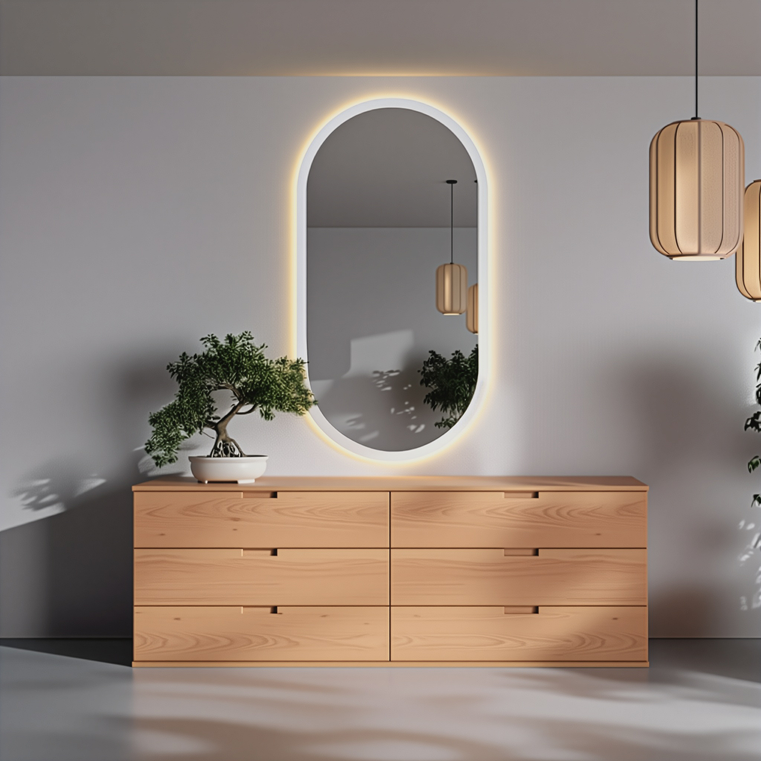 Cardiff to zaawansowane lustro owalne LED z podwójnym systemem oświetlenia. Tafla z bezołowiowego szkła AGC Mirox 4Green wykonana jest tak, aby zmaksymalizować odporność na wilgoć i zagwarantować doskonałą jakość odbicia. Precyzyjnie szlifowane krawędzie na włoskich maszynach Bavelloni nadają mu elegancki wygląd premium. Model dostępny w rozmiarach od 40×75 do 80×150 cm jest doskonałym wyborem dla osób oczekujących wysokiej funkcjonalności oraz estetyki.