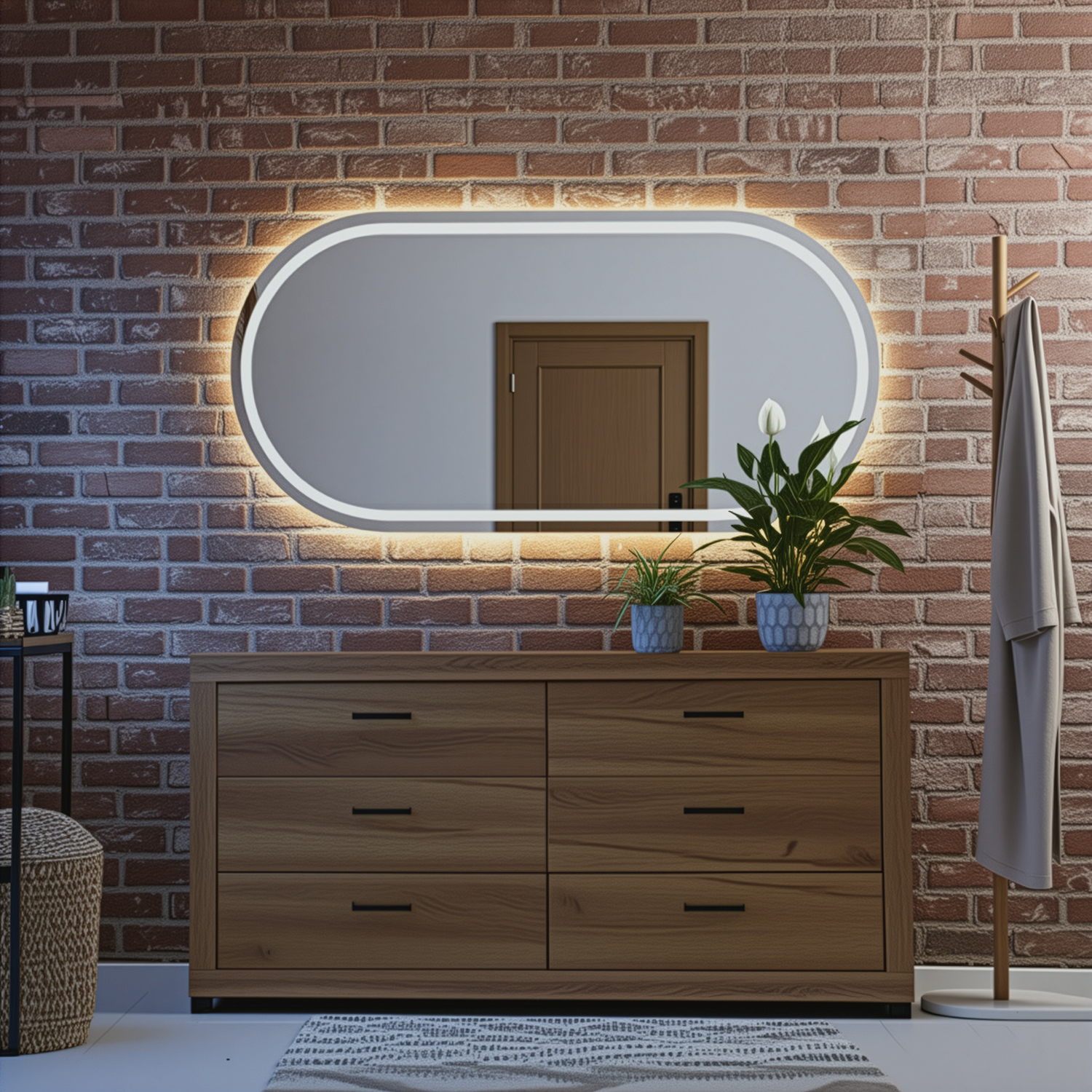 Liverpool wyróżnia się podwójnym systemem oświetlenia – ramka LED umieszczona wewnątrz tafli tworzy efekt pierścienia, podczas gdy tylne podświetlenie generuje miękką aureolę na ścianie. To połączenie światła kierunkowego i ambientowego podnosi komfort codziennego użytkowania i nadaje mu oryginalny wygląd. Lustro LED owalne oferuje barwy 3000K, 4000K i 6500K oraz ściemnianie za pomocą dotykowego włącznika. Mata antyparowa zwiększa praktyczność użytkowania w pomieszczeniach o wysokiej wilgotności.